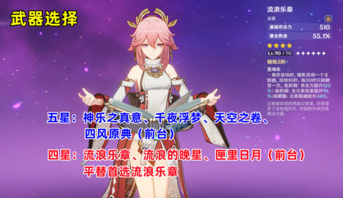 五星武器可选:神乐之真意、千夜浮梦、天空之卷,如果是前台玩法还可以考虑四风原典。四星武器可选:流浪乐章、流浪的晚星,前台玩法还可以选匣里日月。一般情况下,平替首选流浪乐章即可,三种特性加成无论随机到哪种,八重神子都能用上。