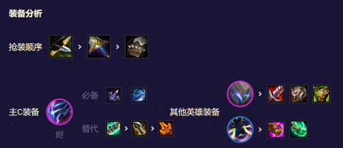 烬主C,轻语必备,提高烬的输出,不然容易打不动前排。第二件巨杀,处理前排大肉更快一点,第三件可以根据场上情况来出,出科技枪的现在很多,这样续航能力更好一点,也可以出无尽或杀人刀进一步提高爆发,总之出装不是一成不变的,要视情况而定。