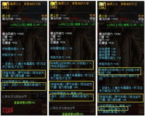 被吞噬的太阳:勇气祝福增加4%的独立攻击力,启示:圣歌增加116点智力;被吞噬的大地:勇气祝福增加4%的独立攻击力,启示:圣歌增加96点智力,60-80级的技能等级加1级;被吞噬的天空:勇气祝福增加4%的独立攻击力,启示:圣歌增加86点智力,1-45级的技能CD减少15%。