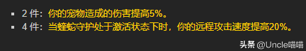 对于四件套装在蝰蛇守护激活下的攻速提高,你想想哪个猎人会一直挂着这东西来打输出的,所以看似20%攻速非常恐怖如斯,但是喵叔只能说毫无作用。