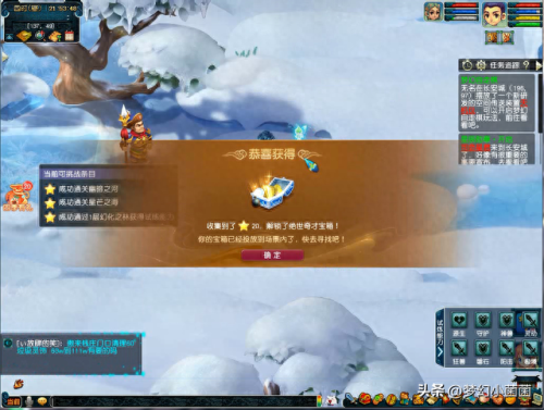 完成任务后,传送到北俱芦洲场景,场景内有泡泡,可以点击获得经验和银两(有次数限制),场景内还可以找到自己的宝箱(此处可以打开BGM,”听声辨位“寻找宝箱!)。最终,根据自己的星数获得不同的奖励。