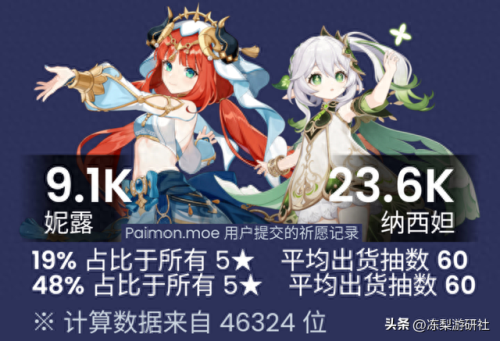 以上为此次关于3.6版本上次妮露纳西妲卡池的部分数据情况,由于数据样本有限,你要说代表整个玩家群体不太严谨,图一乐看看就好了~
