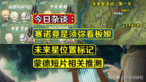 这次3.2版本前瞻定在了10.23号,也就是周日晚的8点。冻梨去大概翻看了一下各地区运营放出的预告图,发现个有趣的事实。目前存在4种图,其中赛诺必在,空荧派蒙纳西妲则是排列组合随机出现,见下图。