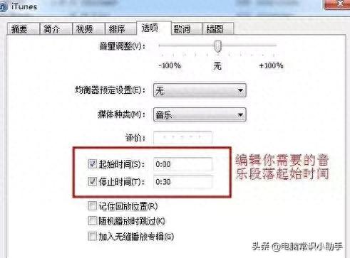 6、进入后,找到“”选项卡,然后在“”进行起始时间的修改。这个起始时间就是你需要的铃声片段,在工具中已经让大家进行准备。然后在起始时间处填写,并勾选。弄好后点击“确认”。(PS:铃声长度不得大于40秒,一定要注意,一旦超过40秒,会导致同步不成功。)