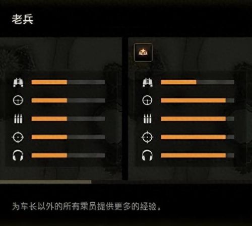 车长的“老兵”技能在1.20.1版本中也得到了修改。“老兵”技能的效果是为除车长以外的坦克乘员提供更高的经验加成,该设计的目的是让经验丰富的车长与新的乘员“搭班子”时,可以让新乘员快速提升。但这也让车长获取的经验降低,在1.20.1版本中,“老兵”技能的效果也会惠及车长。