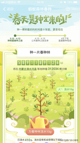 而且参与蚂蚁森林官方出的“春种”活动,3月12日-4月12日之前,连续参与活动浇水,可以获得纪念装扮、森林道具、成就证书、春种之旅等奖励。森林道具里面就有能量时光加速器和能量罩,基本每天浇水都可以获得一个道具,离活动结束时间越来越近,还不知道的可以参与下,获得收能量外挂道具,真的好用。